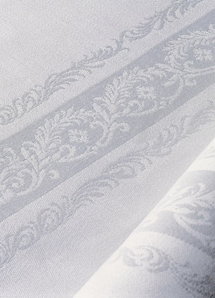 Wir offerieren Ihnen ein sehr fein, in kleinen Schnörkeln ineinander geschlungenes Relief in weißem Reinleinendamast.