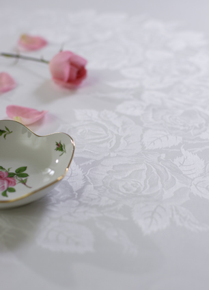 Die Rose, Königin der Blumen schmückt Ihren Tisch mit unserer weißen Reinleinendamast Tischwäsche NK 500. Diese ist aus bester Bielefelder Qualität - seit über 100 Jahren bewährt.